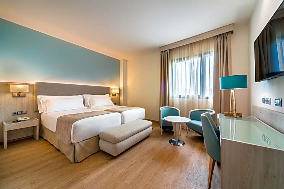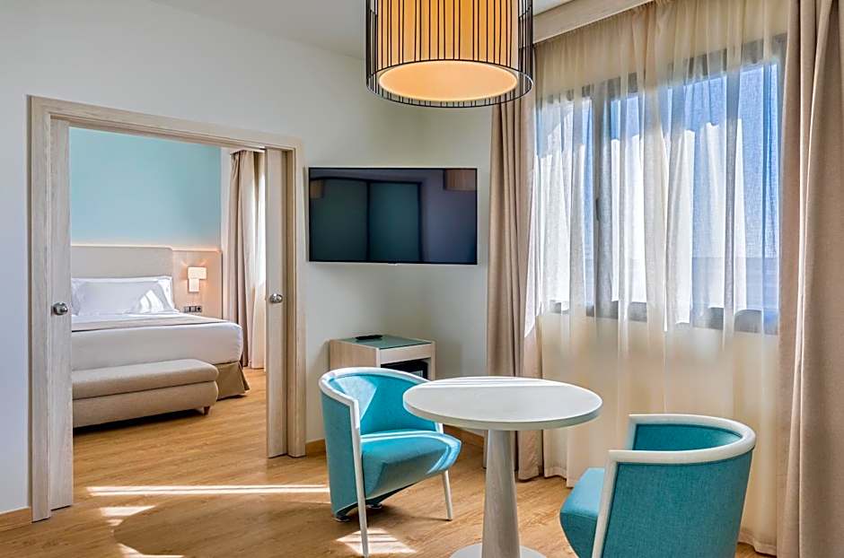 Measuring 34 square yards. This spacious suite has 3 separate spaces: the bedroom, a spacious, fully equipped bathroom and a separate living room (with sofa and armchairs). The room has a king-size bed (2x2) and offers the option of adding extra beds for up to two children in the living room; as well as a cot. They are ideal rooms for families that need more space.